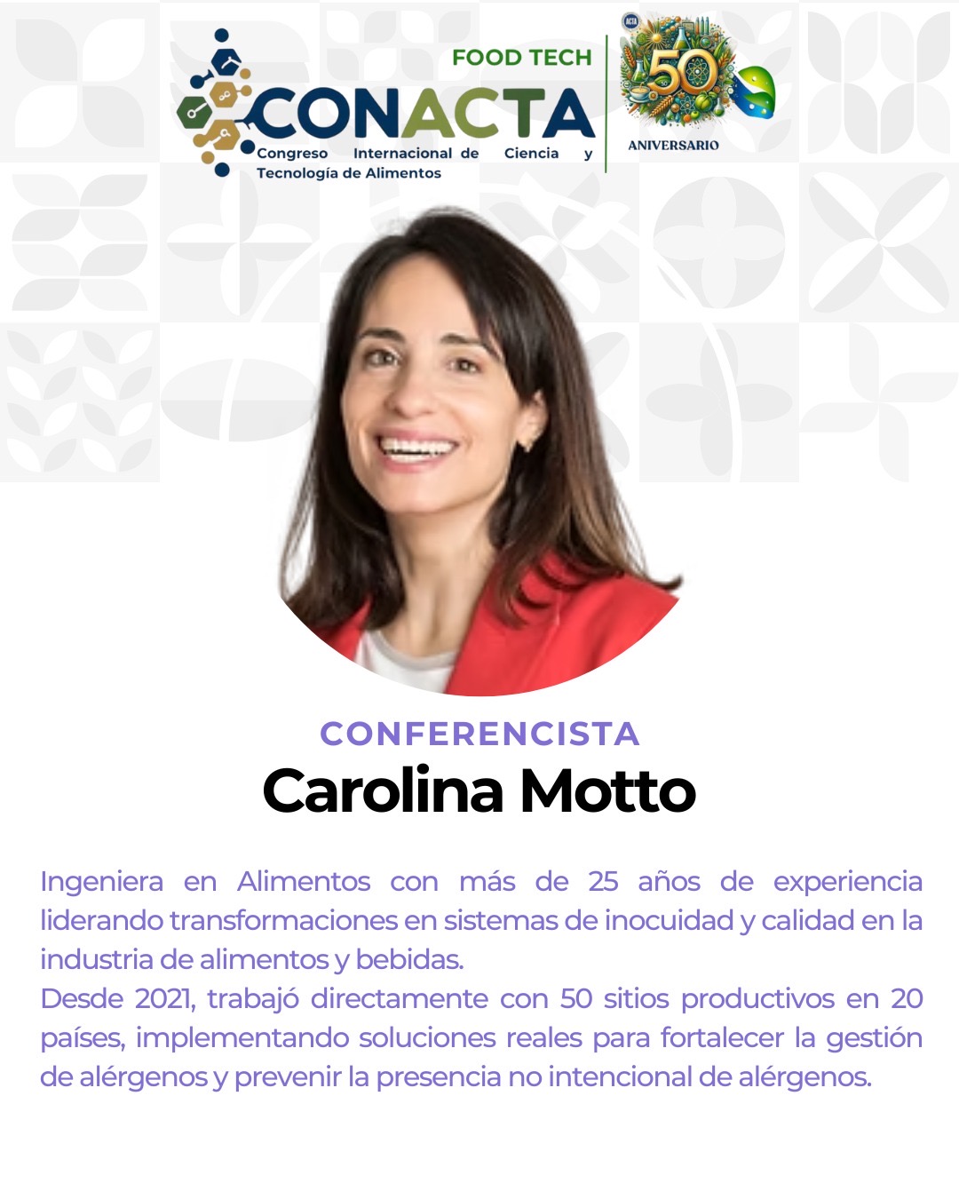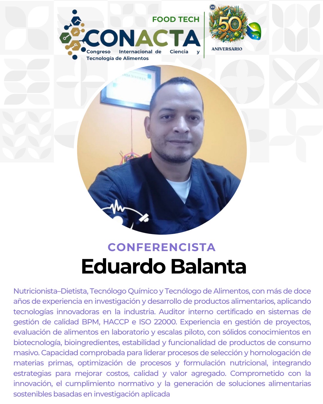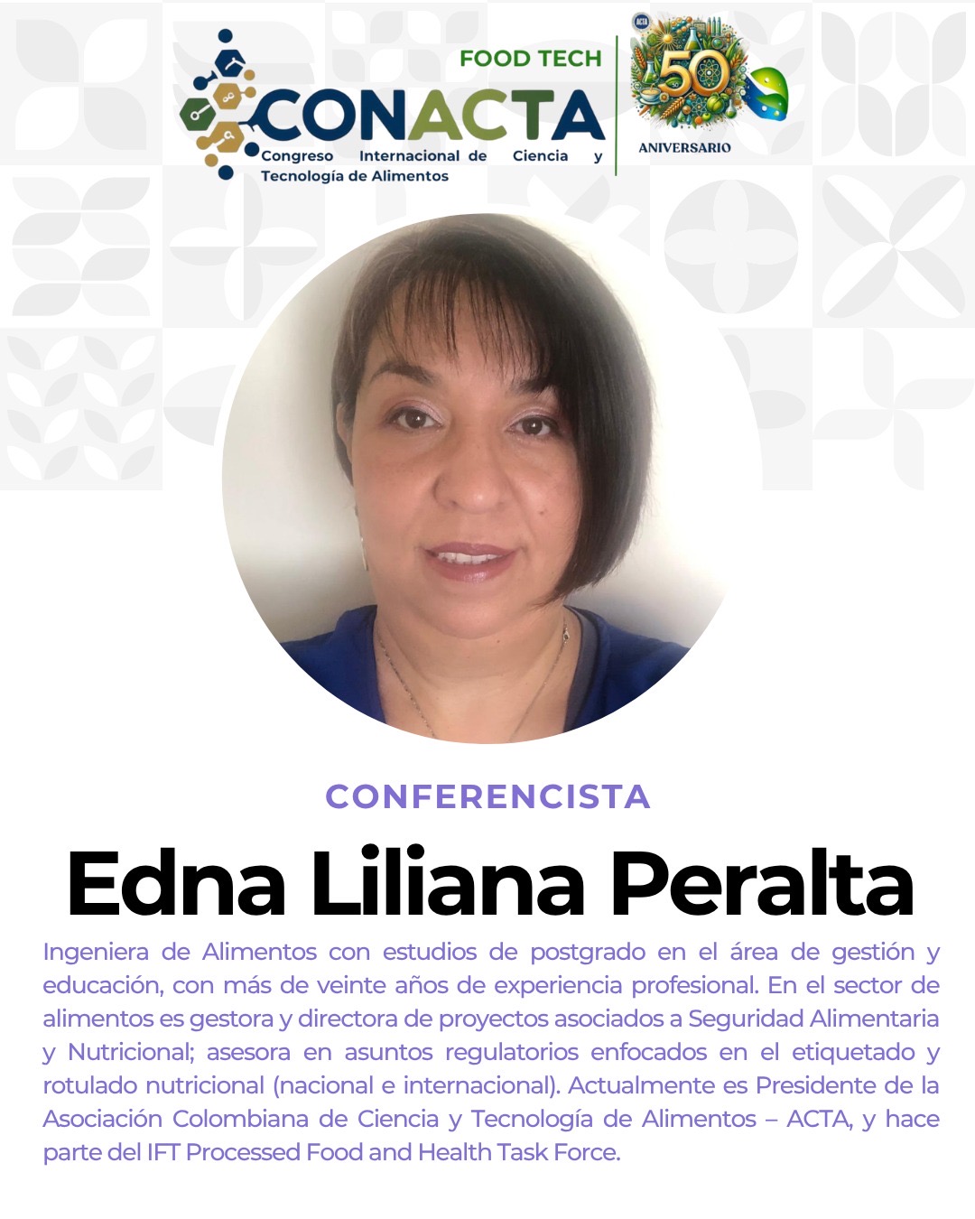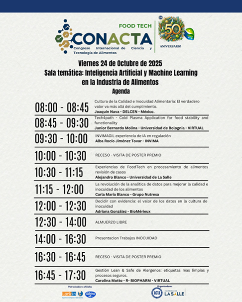 Bienvenidos al Congreso CONACTA 2025 – FOOD TECH un espacio de encuentro y reflexión que celebra medio siglo de aportes por parte de ACTA que esta cumpliendo 50 años de labor. Este evento tiene como propósito explorar, discutir e impulsar la innovación en la industria alimentaria, promoviendo la integración de tecnologías emergentes y fomentando la colaboración entre profesionales, investigadores y emprendedores.