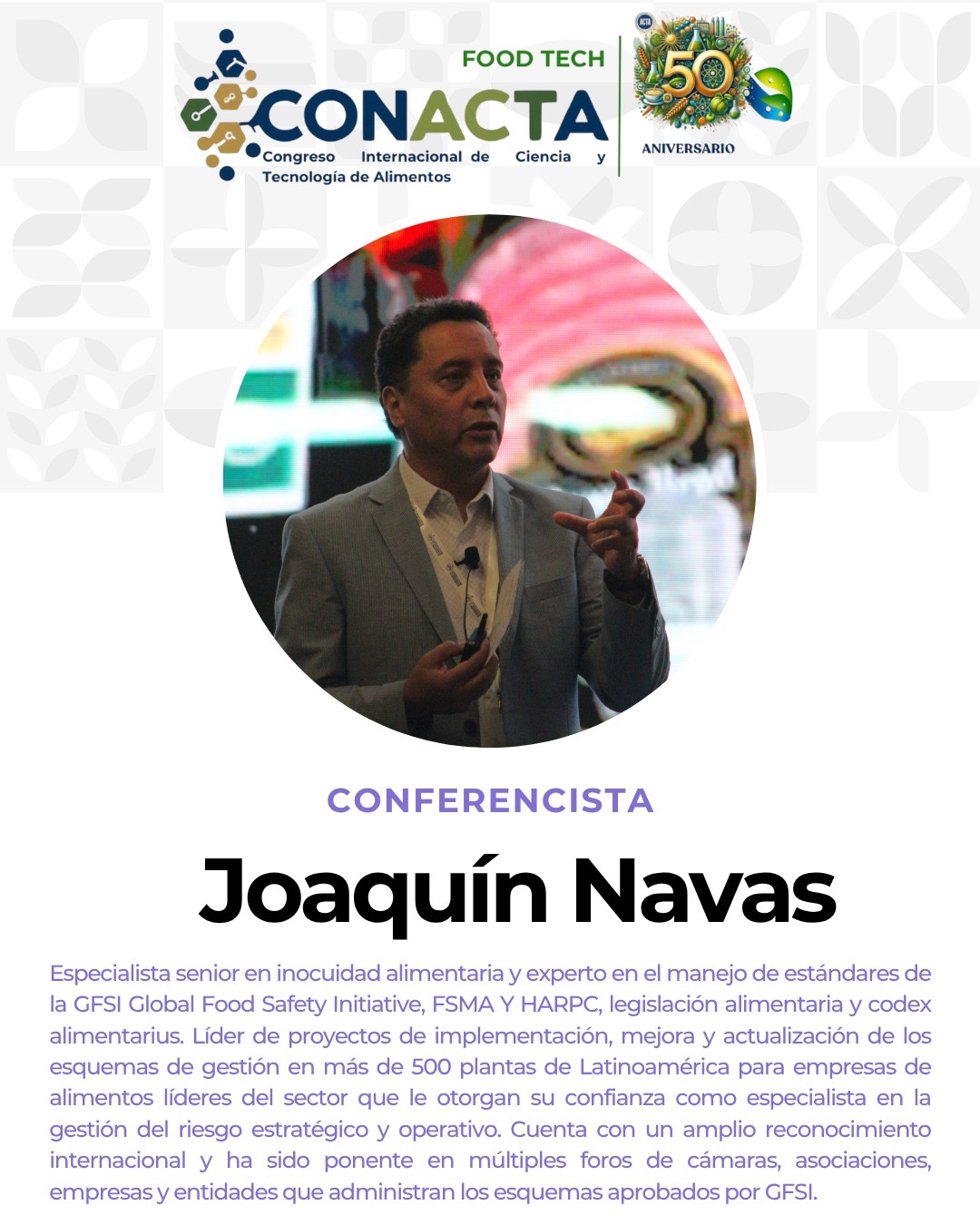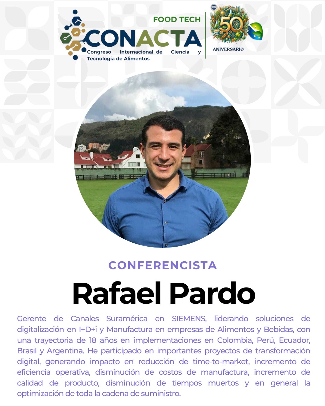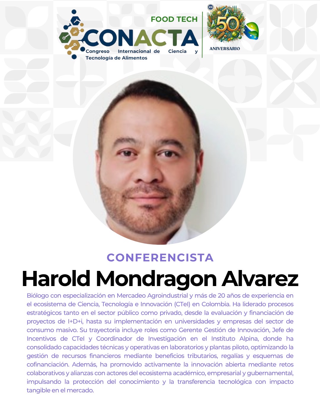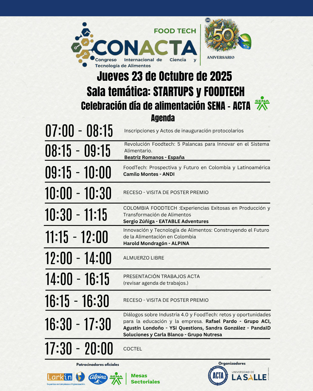 Bienvenidos al Congreso CONACTA 2025 – FOOD TECH un espacio de encuentro y reflexión que celebra medio siglo de aportes por parte de ACTA que esta cumpliendo 50 años de labor. Este evento tiene como propósito explorar, discutir e impulsar la innovación en la industria alimentaria, promoviendo la integración de tecnologías emergentes y fomentando la colaboración entre profesionales, investigadores y emprendedores.